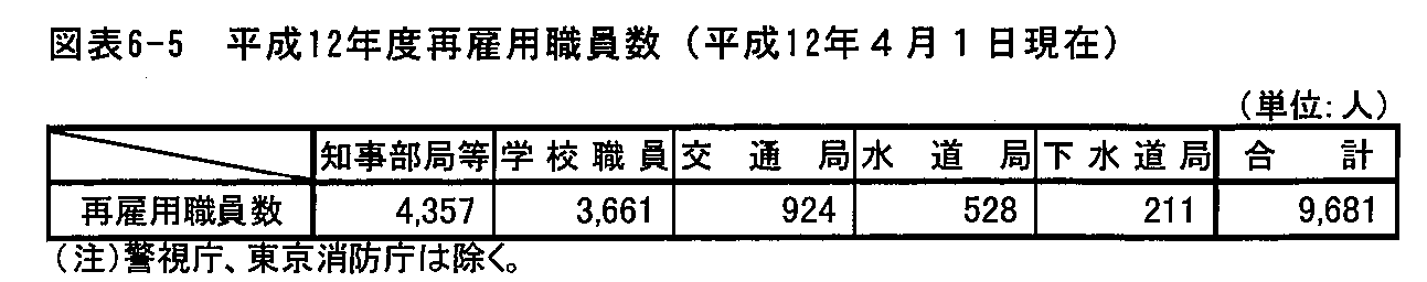 再雇用職員数は、平成12年4月1日現在、都全体(警視庁・東京消防庁を除く)で、9,681人である(図表6-5)。