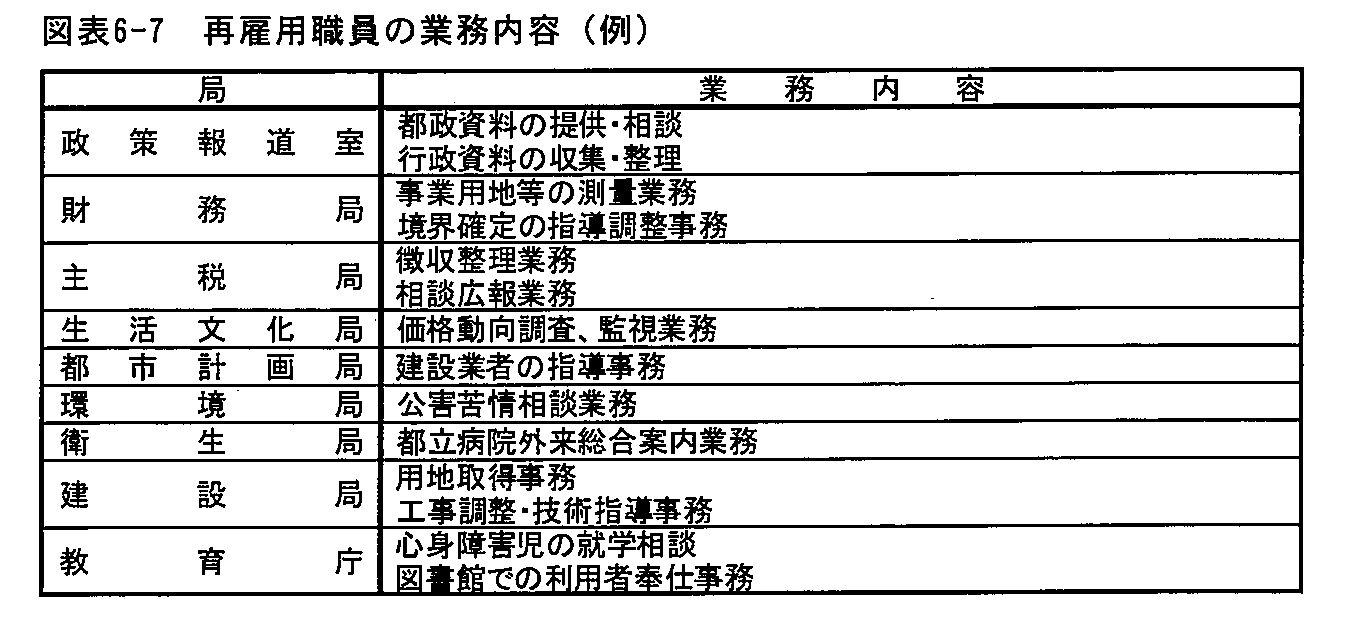 現行の再雇用制度は、昭和60年度に、職員の高齢化の進行や定年制の導入に伴い定年退職者等の増加が見込まれる中で、退職者の知識・経験の活用による、職員の退職後の生きがいの確保と生活の安定、都民サービスの向上、高齢化社会への対応という新たな観点から制度化したものである。その後、平成元年度(更新回数の増など)、平成4年度(勤務日数の弾力化など)、平成5年度(適職基準の見直しなど)の改正を経て、現在に至っている(図表6-1)。